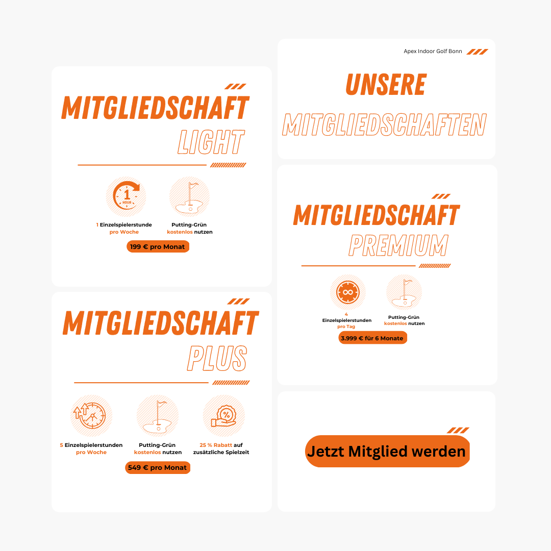 Ob Gelegenheitsgolfer oder ambitionierter Spieler. Wähle spontane Spielsessions oder profitiere von Mitgliedschaften mit exklusiven Vorteilen. Unsere Gutscheine sind zudem das perfekte Geschenk für alle Golfbegeisterten.